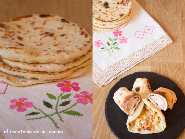 Le encanta hacer pan casero, pero aunque el día había refrescado un poco, todavía en las casa hace calor, así que descartamos la idea de hacer pan, por no encender el horno y porque había que esperar el levado. De repente, me acordé que había visto en la revista Thermomix magazine un pan que me recordaba al pan de las fajitas y que suelo rellenar con jamón de york y queso, o con un revuelto de jamón de york y en casa nos gusta mucho.